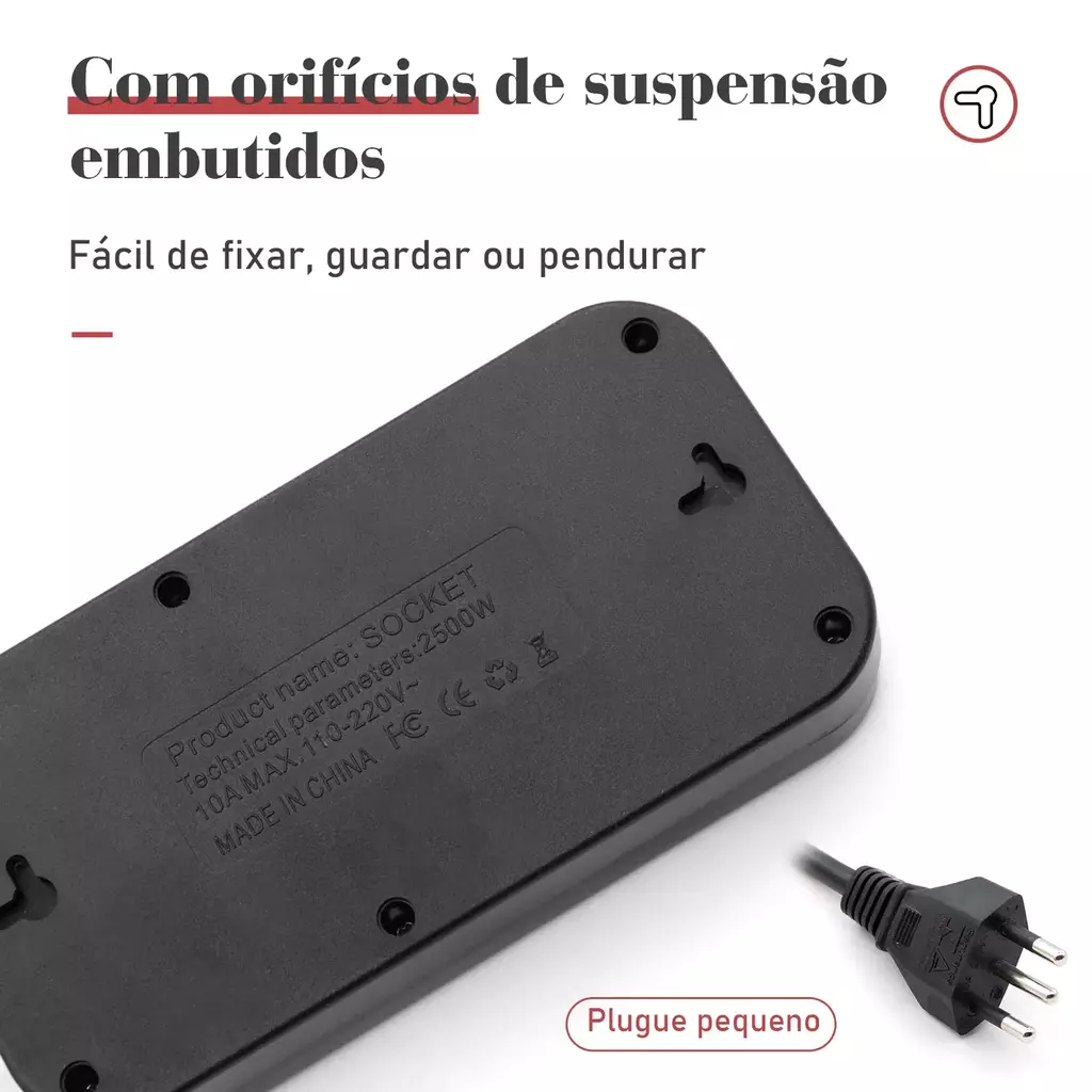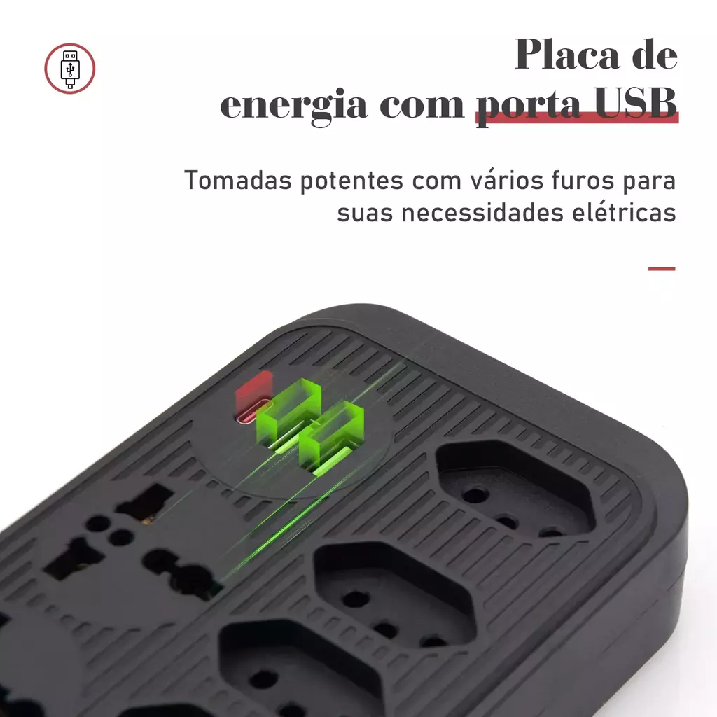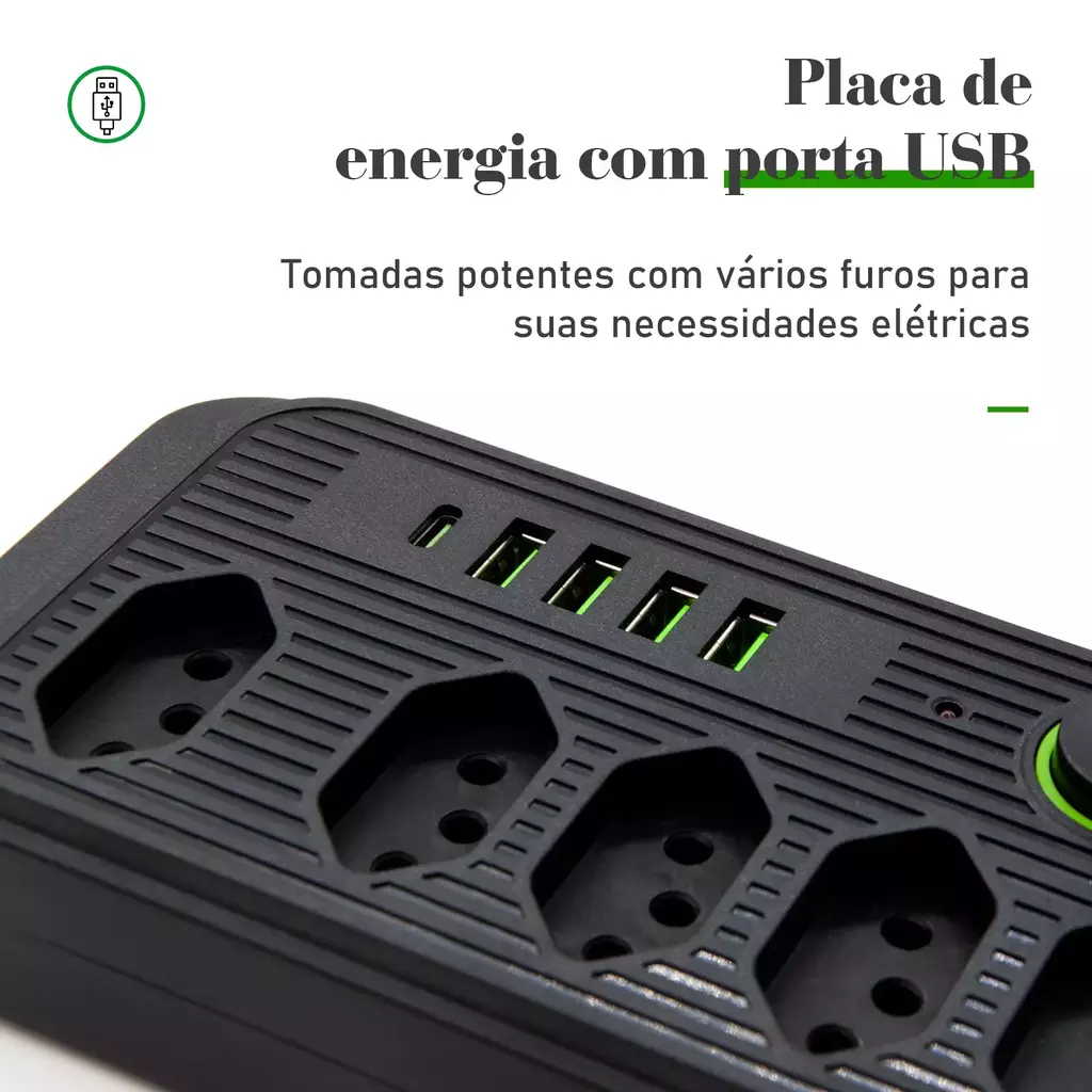 A porta USB integrada é um alívio na hora de carregar seu celular, tablet ou fones de ouvido, liberando espaço para outros eletrônicos na régua.