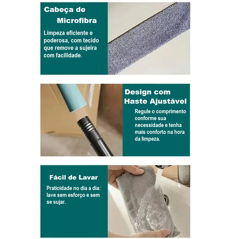 Com design ergonômico, cabo ajustável e cabeça flexível de microfibra, este acessório se adapta facilmente aos diferentes cantos da casa, alcançando lugares que antes pareciam impossíveis. Mais do que uma ferramenta de limpeza, ele é um aliado para quem busca mais tempo livre, praticidade e bem-estar em um lar sempre limpo e acolhedor.